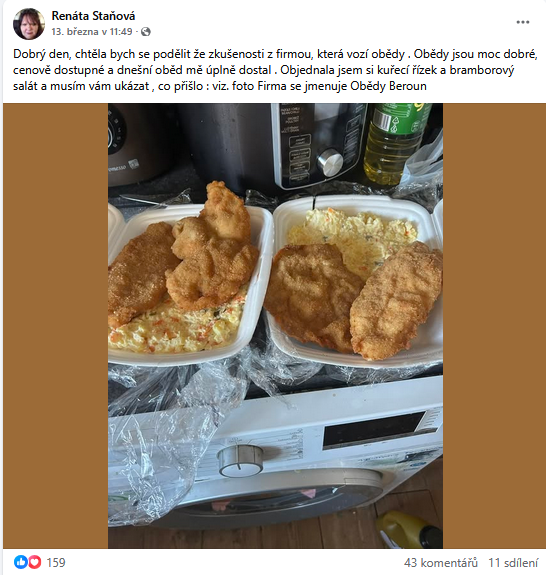 Tuto firmu určitě doporučujeme! Vyzkoušeli jsme více dodavatelů, ale Obědy Beroun jsou zatím nejlepší. Denně pestrá nabídka chutných jídel, polévek a baget určitě uspokojí každého strávníka. Jídlo není třeba dochucovat, zkrátka domácí kuchyně jak má být! Pochvala kuchařům i rozvozcům, kteří jezdí např. až do Jinec. Děkujeme a přejeme hodně spokojených klientů. „Obědy Beroun – firma, kvůli které se těšíme na pracovní dny.“ :-))
